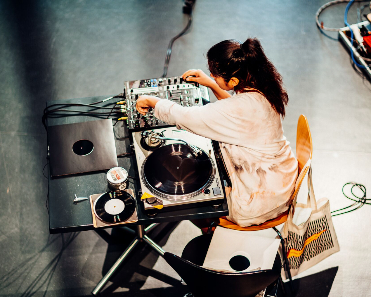 Maria Chávez (b. 1980, Lima, Peru) is an abstract turntablist, sound artist, and DJ from Lima, Peru, and now based in New York City. Her work explores coincidence, chance, and failure across various mediums, including improvised performance, visual art, and multi-channel installations. Unique in her field, Chávez is the only artist using the RAKE Double Needle—a rare tool with two needles that read different segments of a single record simultaneously. This, combined with her skill in transforming broken records into compelling sonic experiences, makes each performance distinct. Her innovative work has been featured and supported by Rewire Festival, Counterflows Festival, Donau Festival, MoMA PS1, The Getty, and DOCUMENTA 14.