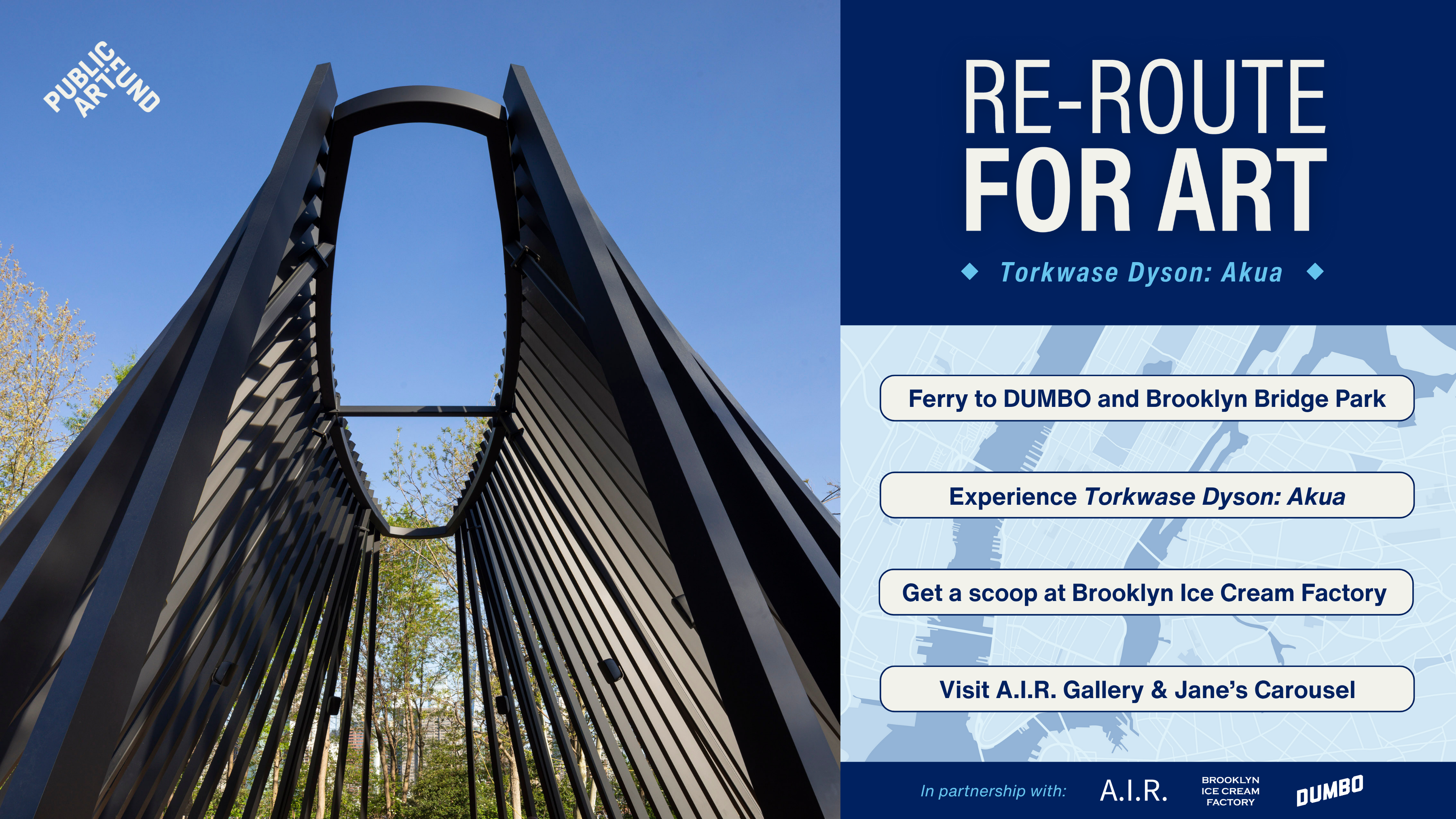 Take a weekend trip this summer to Brooklyn Bridge Park and experience Torkwase Dyson: Akua, Dyson’s large, open pavilion. Surrounded by grand waterways and architectural landmarks, Akua invites audiences into a space of contemplation and imagination, grounded in the landscape beneath and encircling us. Need a break from the heat? From Brooklyn Bridge Park, take a quick stroll to Brooklyn Ice Cream Factory and grab a scoop of their summer selections. Complete your art-filled day with a visit to A.I.R. Gallery and a carousel ride at Jane’s Carousel. Check out Public Art Fund Ambassador Mac Cumpian’s route and follow along for a full day of summer fun in Downtown Brooklyn.